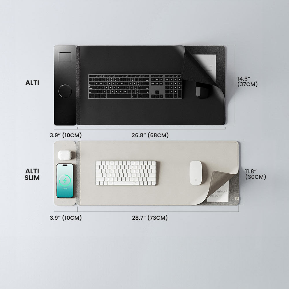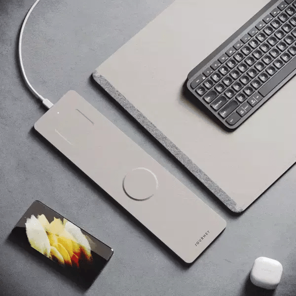 Reversible Desk Mat with a detachable wireless charging panel that fast charges your smartphone and earbuds simultaneously. Features water-resistant vegan leather on one side and plush felt on the other side.