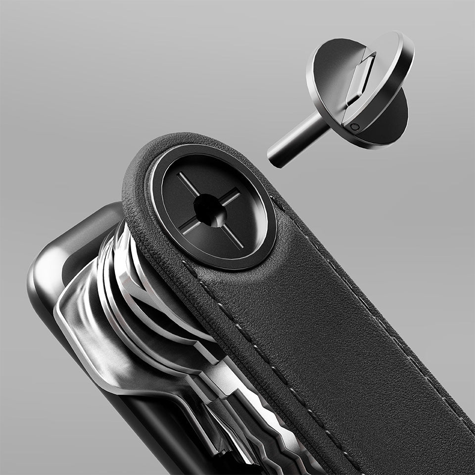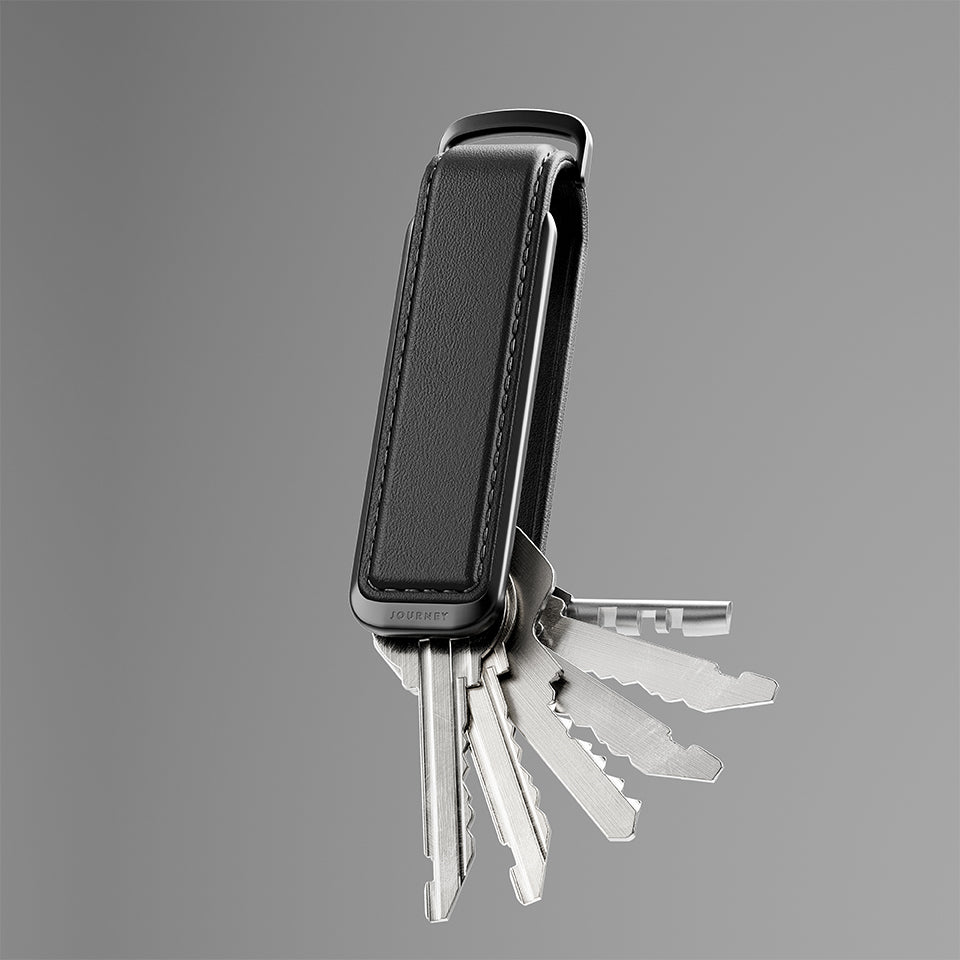 A. A minimalist key organiser made with Nappa leather and stainless-steel hardware. It stores up to six flat keys in a compact, silent stack and eliminates key jingling.